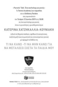 Οι Εκδόσεις ΠΑΤΑΚΗ, και το Tennis Academy Les Raquettes μας φιλοξενούν σε καλοκαιρινή διάθεση, σε ένα πολύ όμορφο και δροσερό χώρο, όπου  η ψυχολόγος του ΙΝστιτούτου Ψυχικής Υγείας EGO IDEAL  κα Κατερίνα Χατζηκαλλία – Κουνιάκη θα παρουσιάσει το βιβλίο της  και θα παραδώσει ένα διαδραστικό workshop για γονείς παιδιών κάθε ηλικίας . Θα έχετε την ευκαιρία να αναπτύξετε προβληματισμούς, να εκφράσετε απορίες και να φύγετε ελπίζουμε και επιδιώκουμε γεμα΄τοι εμπειρίες, σιγουριά και νέες ( παλιές) γνώσεις!
